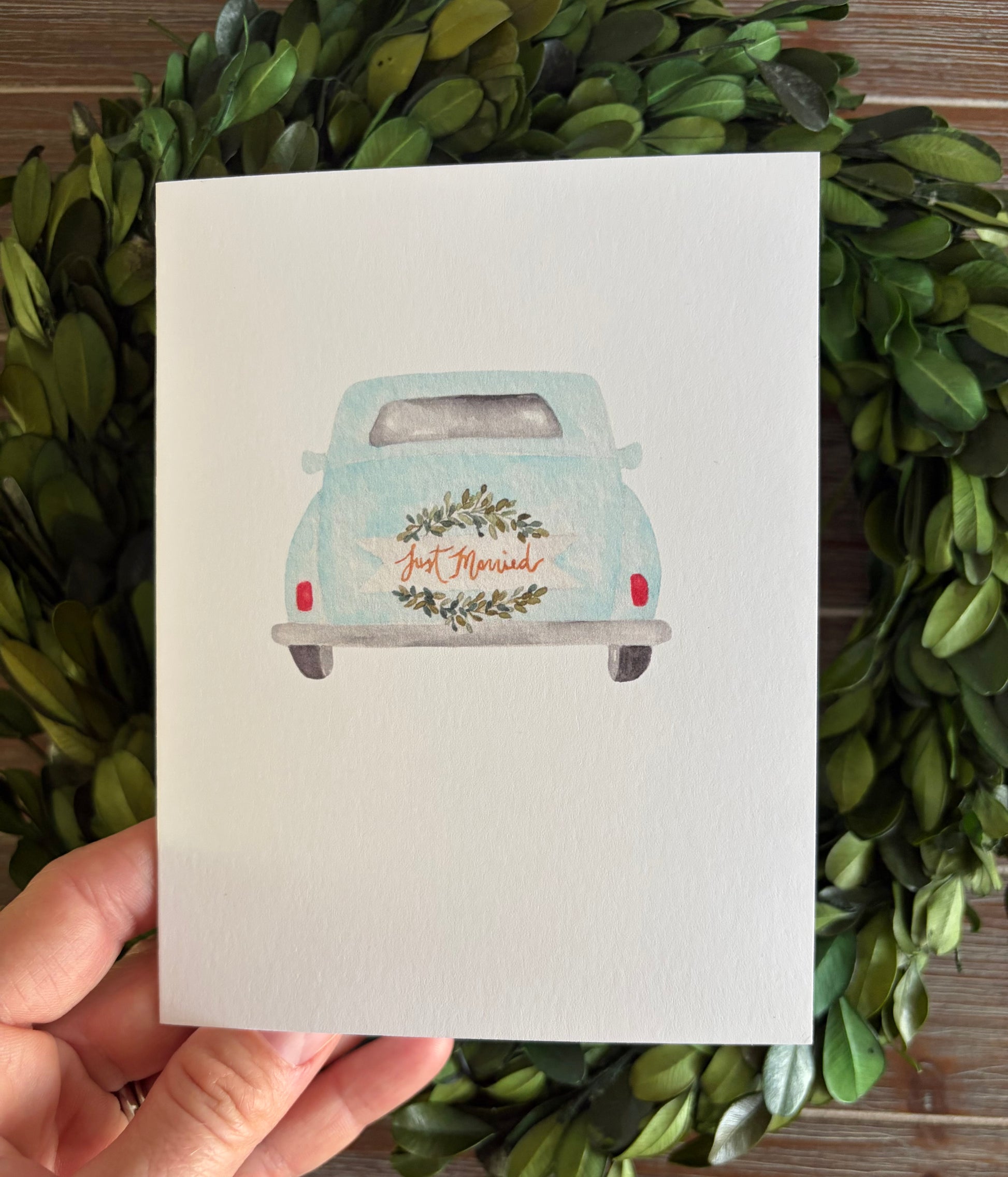 Celebrate the newlyweds with this charming wedding card.  Featuring a light blue, vintage car with a sign that reads, "Just Married", this simple but sweet card offers a warm and memorable way to honor the start of a lifelong adventure together.  This card is blank inside.
