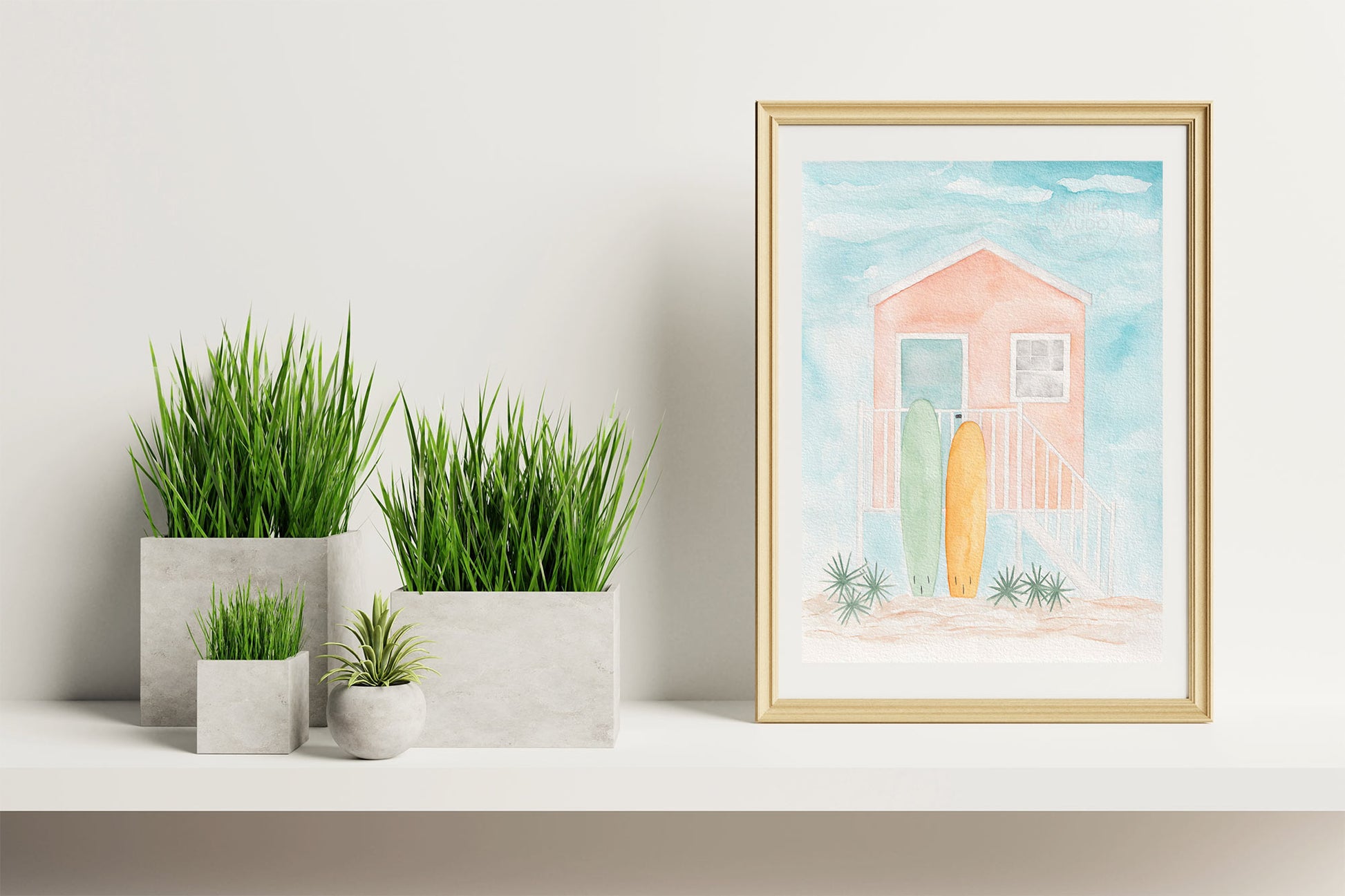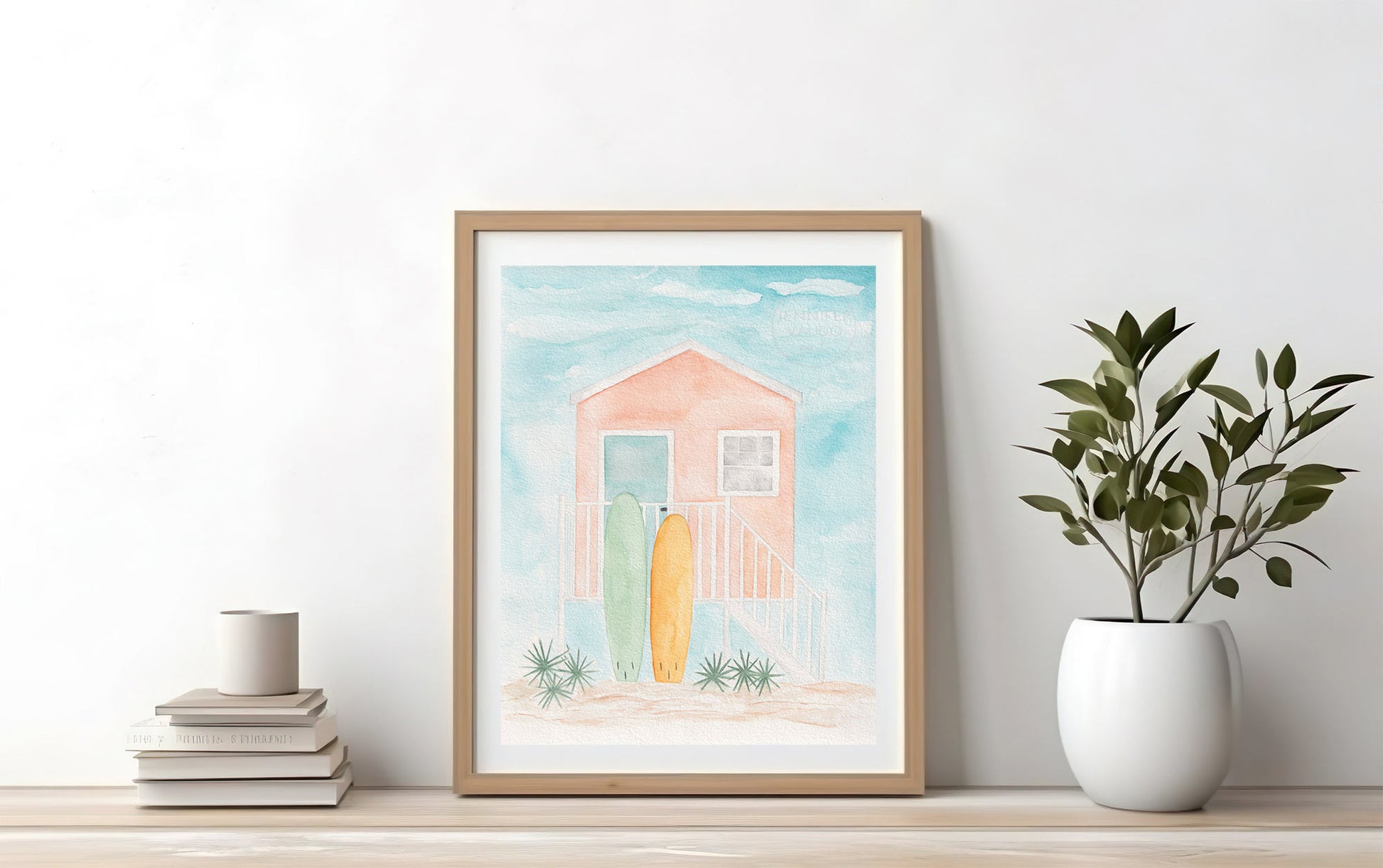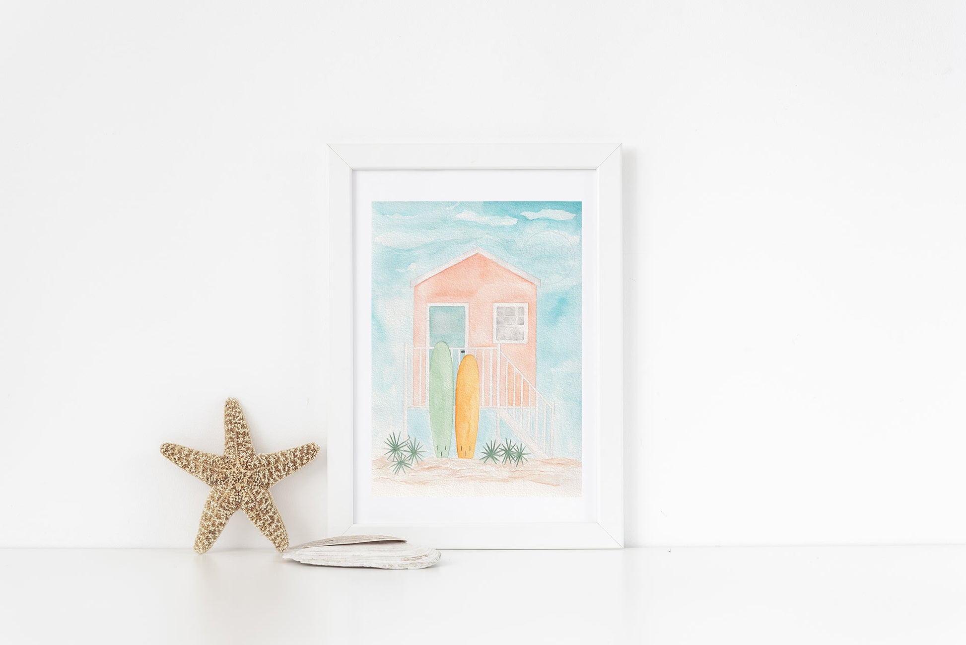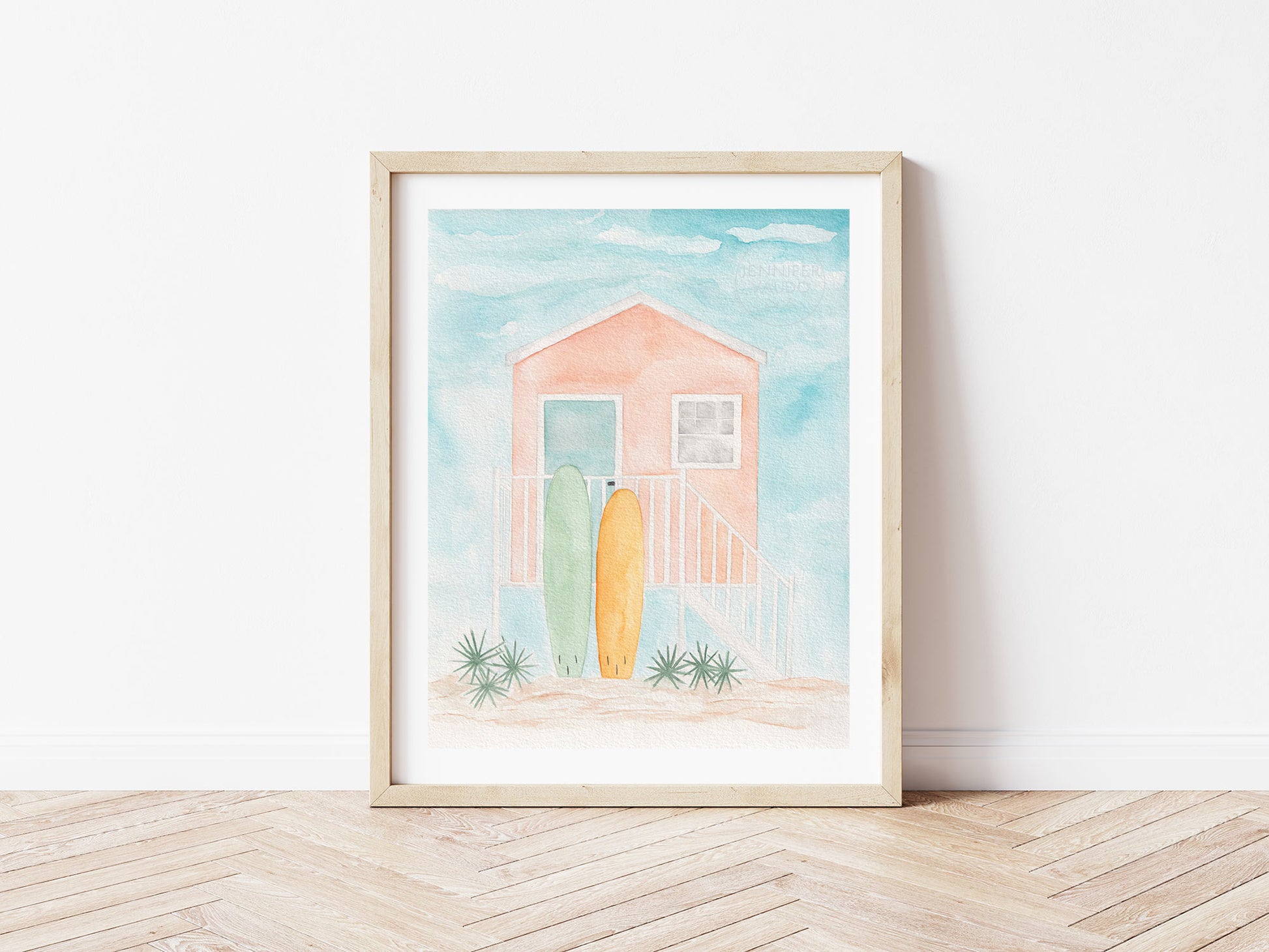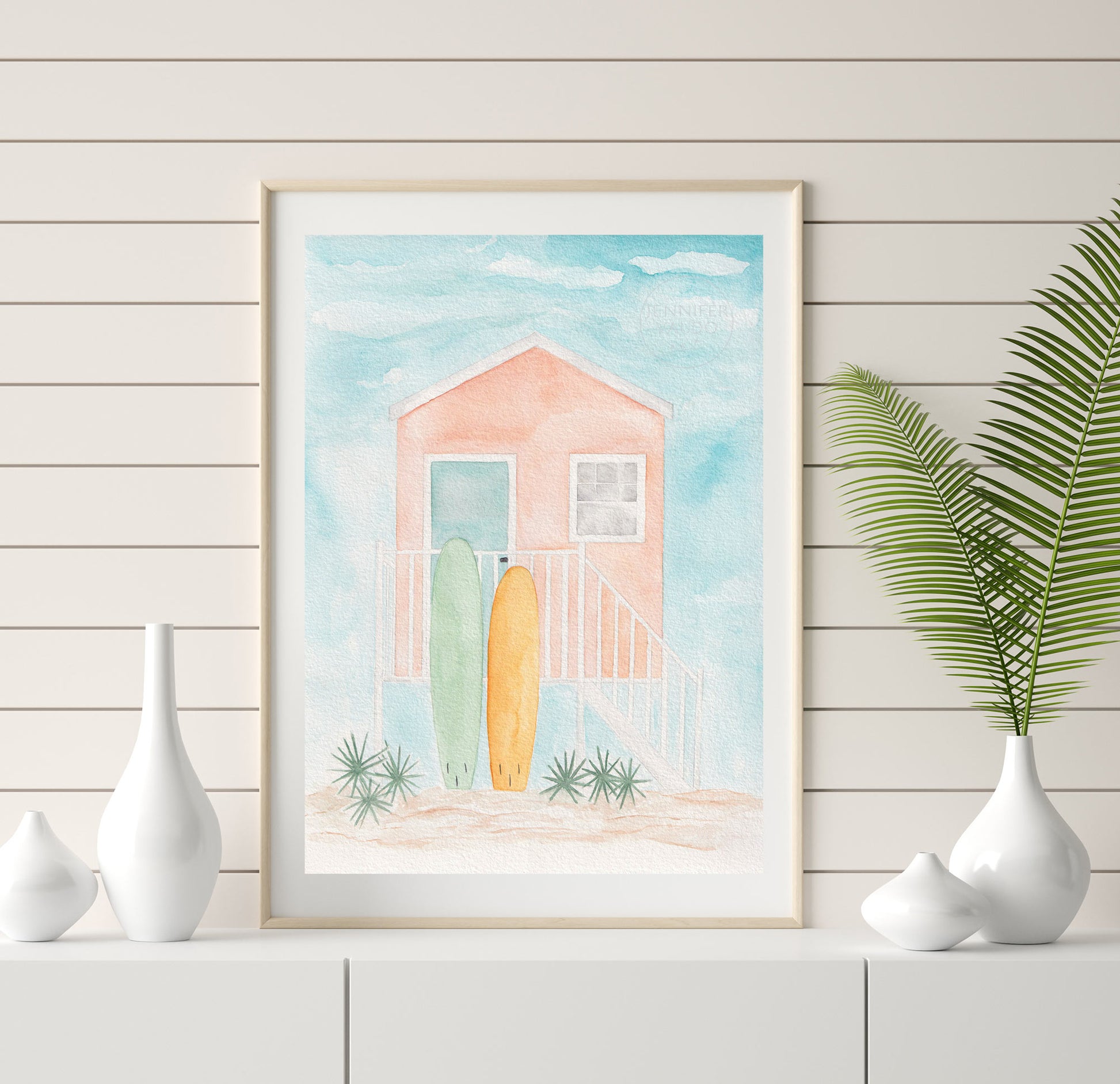 Escape to paradise with a little beach hut and a couple of surf boards! This watercolor print was inspired by the colorful houses that can be spotted up and down the Florida Keys.