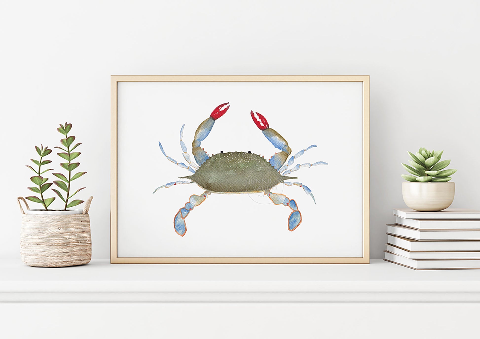 Add a touch of maritime living to your home with this blue crab watercolor print. It features rich green tones and shades of blue with a pop of red. This hand-painted, nautical art print captures the delicate detail and character of this iconic sea creature. Perfect for the seafarer in your life!