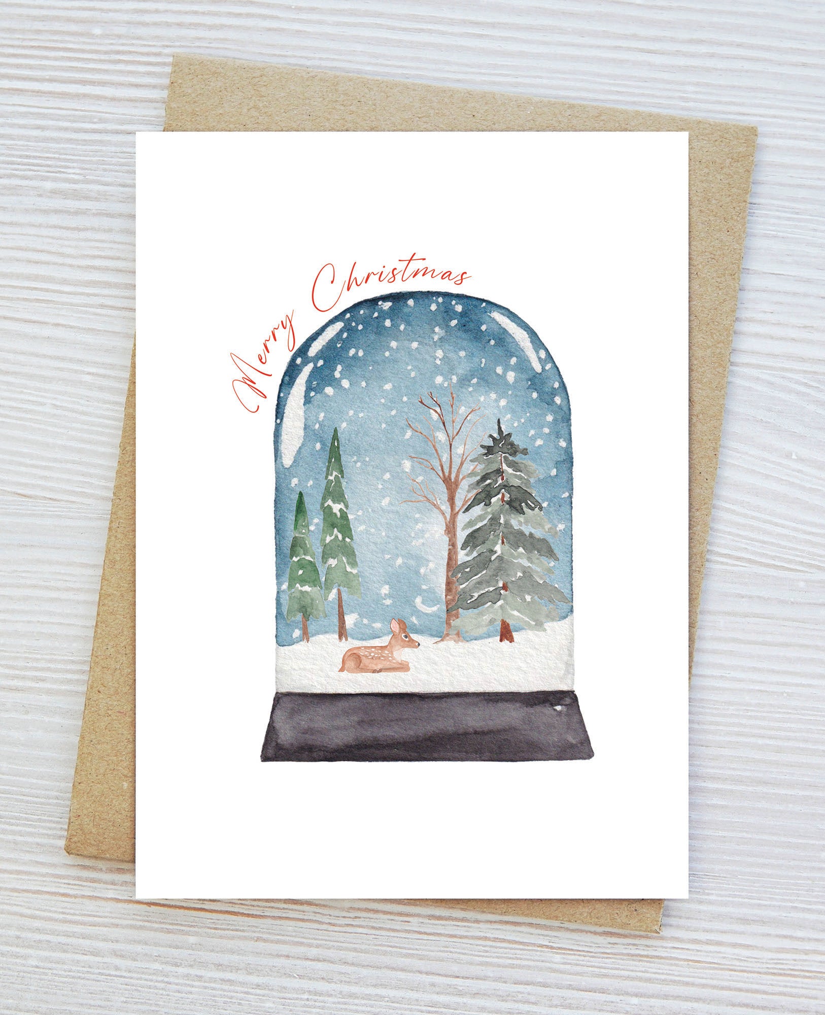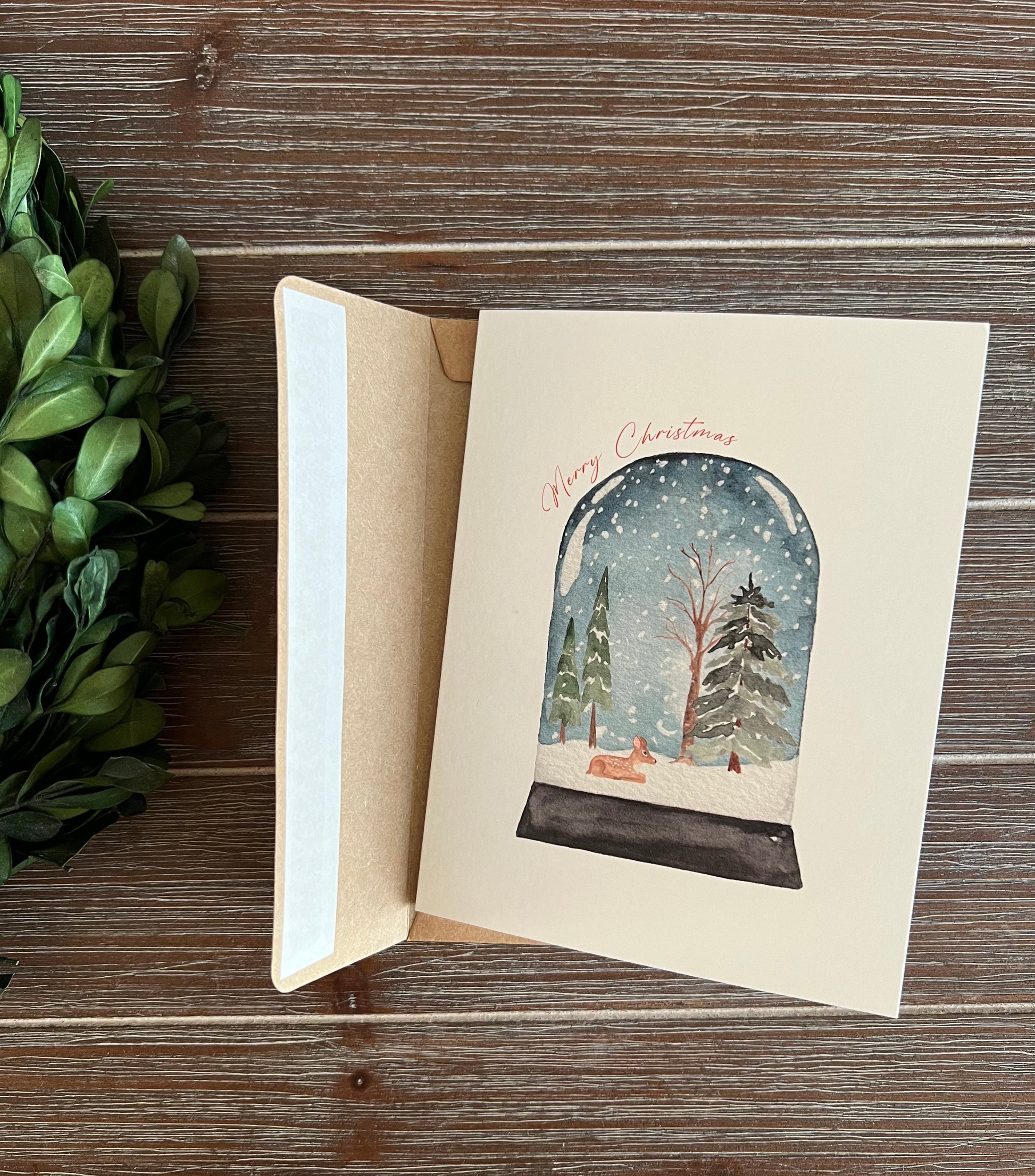 Originally hand-painted, this whimsical snow globe Christmas card features a deer laying in a blanket of snow. This card is blank inside.