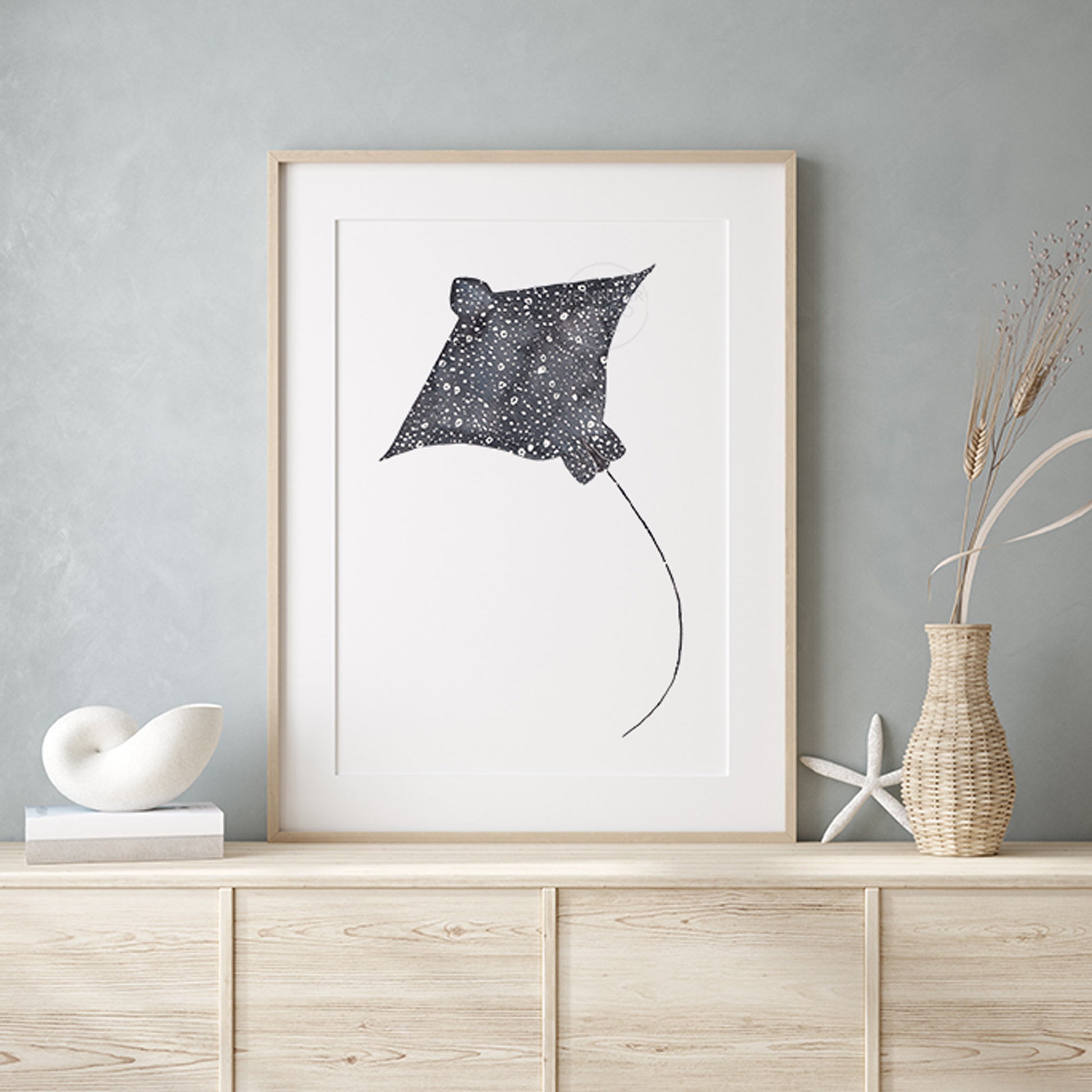 Bring the serene beauty of the ocean into your space with this Spotted Eagle Ray watercolor print. This piece is perfect for ocean lovers, coastal decor enthusiasts, or anyone who finds peace in marine life. It works well as a stand alone piece of wall art or pair it with other marine animals.
