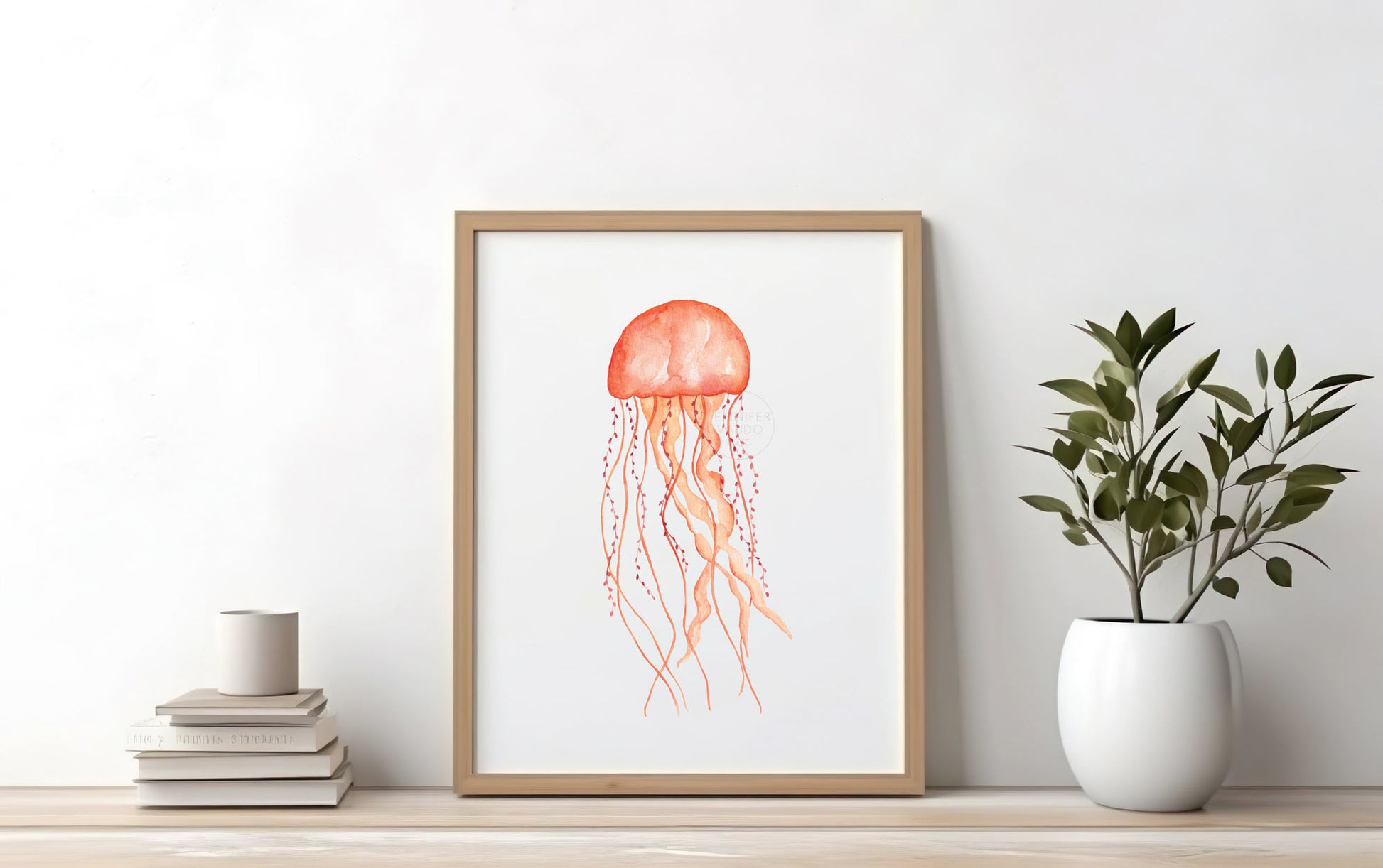This watercolor print is a whimsical take on the more than 2,000 different species of jellyfish that roam our oceans. Add it to your coastal collection for a little pop of color or pair it with other sea life art prints in the shop.