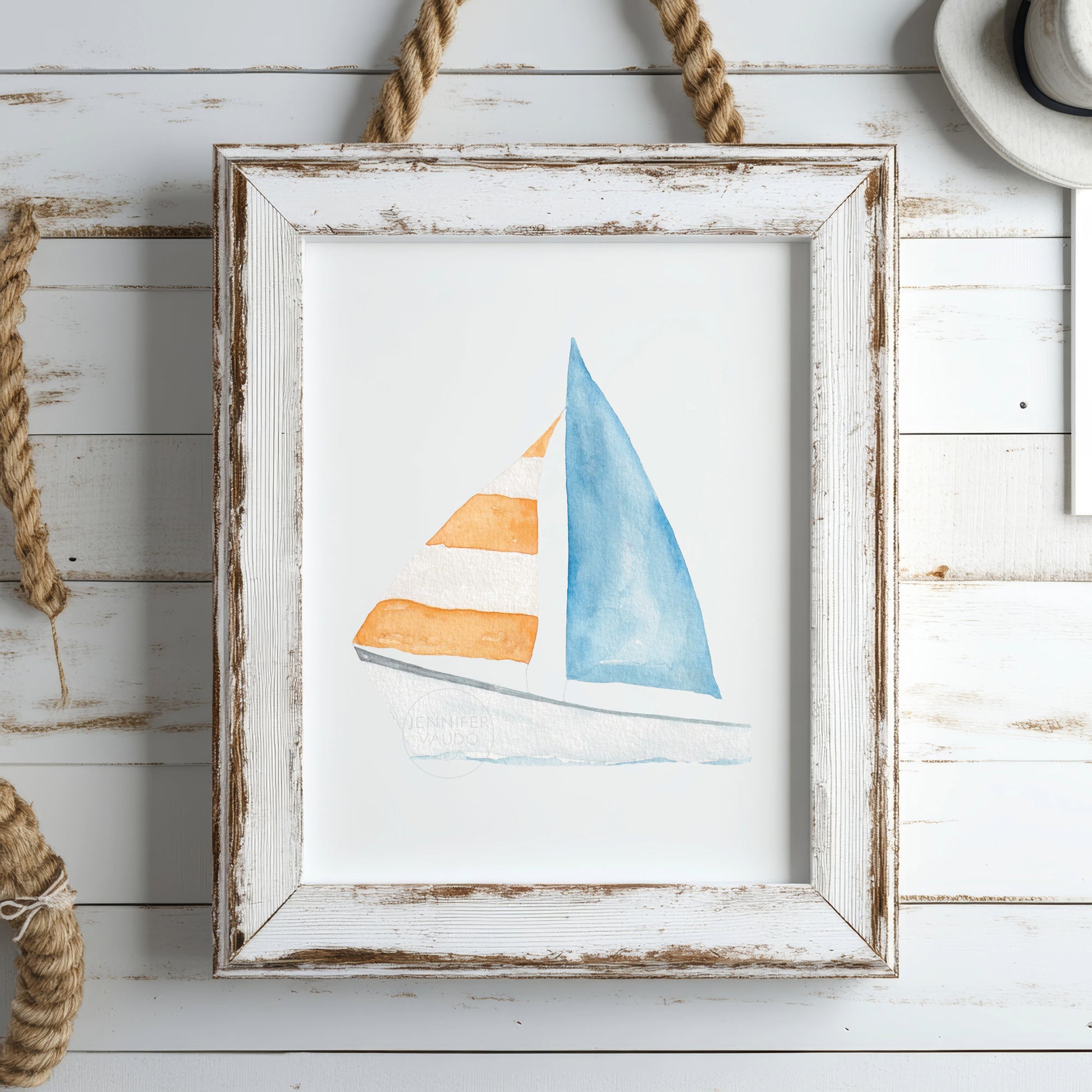 This hand-painted, sailboat, watercolor print features a nautical palette of blue, orange and grey hues.  Perfect for beach house decor, nautical nurseries, or anyone dreaming of the ocean.  Whether you love the open water or call the coast your home, this print brings a touch of maritime magic to any space.