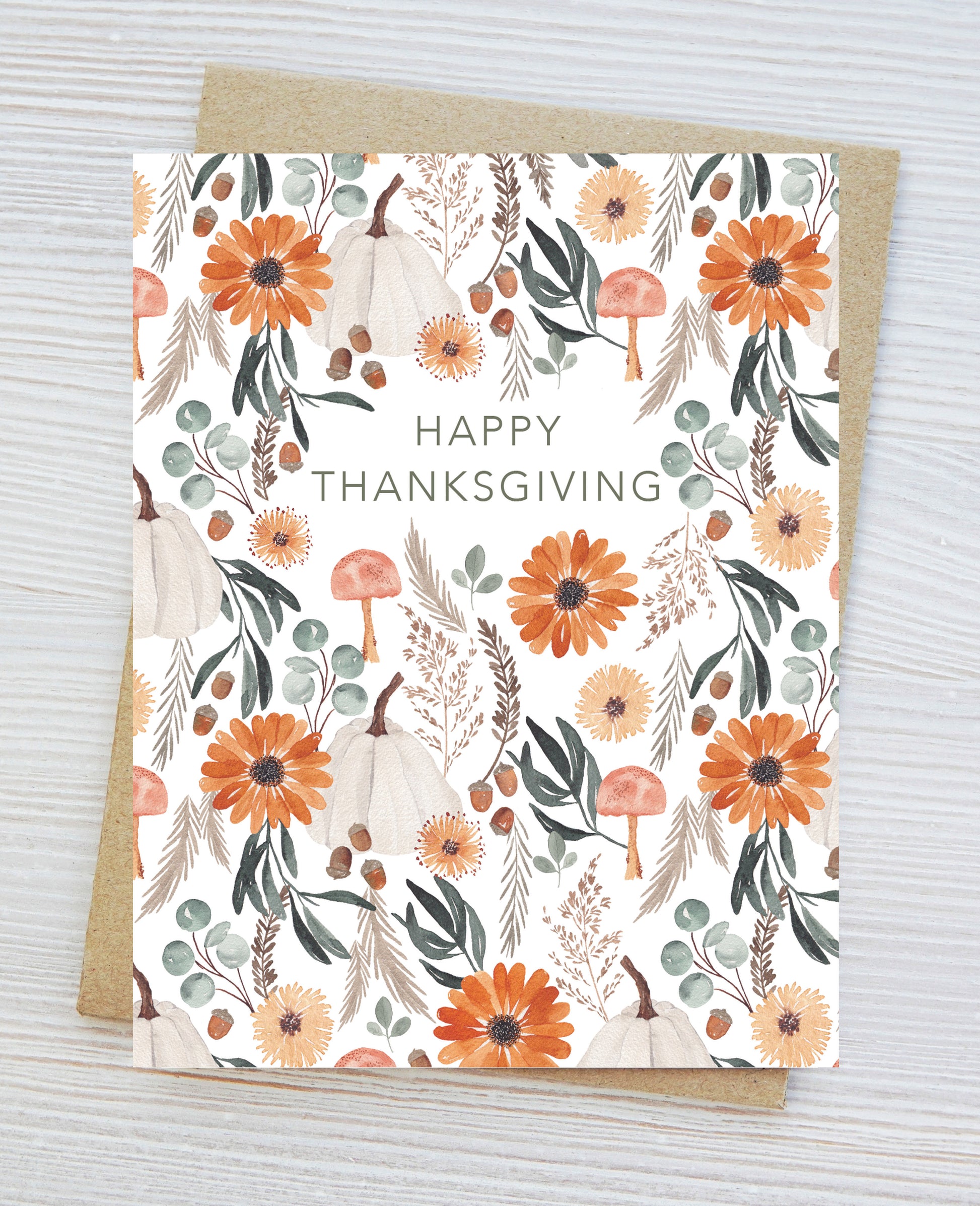 Send warm wishes this season with a watercolor Thanksgiving card, featuring hand-painted autumn florals, acorns, and cozy pumpkins. Painted in rich earthy tones, this card captures the spirit of gratitude and the beauty of the fall in every detail.